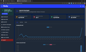 Menampilkan laporan pendapatan, pengeluaran, dan laba bersih dalam format angka dan grafik.
