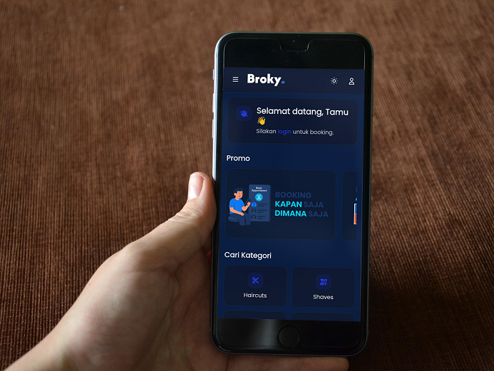 Pengguna dapat melihat promo, kategori layanan, dan barbershop aktif untuk memulai proses booking.