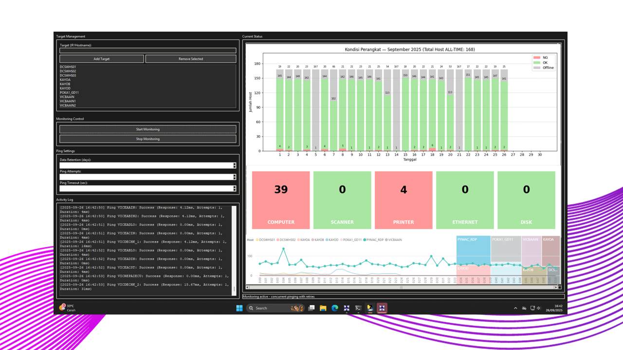 Monitoring yang dilakukan mencakup berbagai indikator penting seperti uptime perangkat, penggunaan CPU, kapasitas dan kesehatan disk, serta status hardware secara keseluruhan. Data dikumpulkan secara berkala dan dikirim ke server pusat untuk dianalisis dan ditampilkan dalam dashboard yang memberikan gambaran menyeluruh kondisi seluruh perangkat produksi.